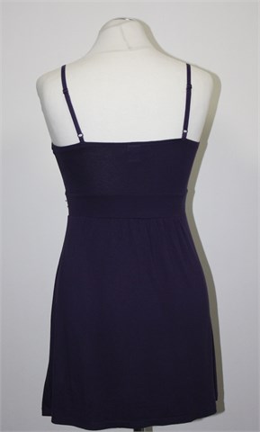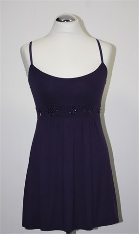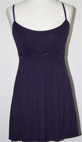 Camaieu majica bez rukava/topić tamno ljubičaste boje (boja patliđana). Podsive naramenice, dupli materijal u dijelu iznad prsiju. Ispod prsiju našivene aplikacije od perlica. Mekana i rastezljiva.