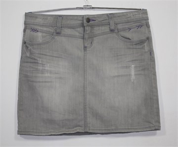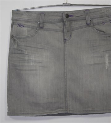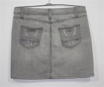 Camaieu suknja od trapera, svijetlo sive boje mjestimično ispranog i iscufanog izgleda (tvornički). Prednji cif i kopčanje, pasica za remen. Prednji i stražnji džepovi, ukrasni preštepi od ljubičastog konca. Blago rastezljiva.