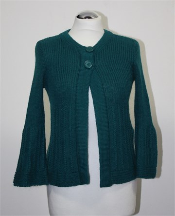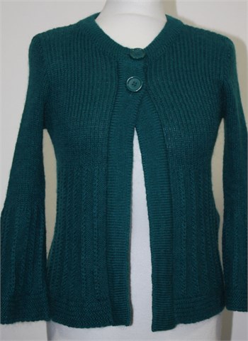 Camaieu vesta sa poludugim rukavima petrolej (zelene) boje. Prednje kopčanje sa dva gumba, uzorak na pletivu. Deblje i mucasto pletivo, rastezljivo.