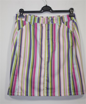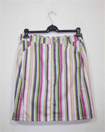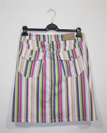 Cambio suknja sa šarenim prugama (boje kao na slikama). Prednji cif i kopčanje, pasica za remen. Prednji bočni, stražnji džepovi sa preklopom i gumbom. Podstavljena, blago rastezljiva. Model kao traper suknja.