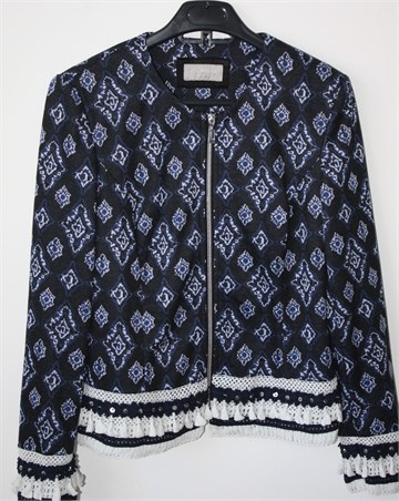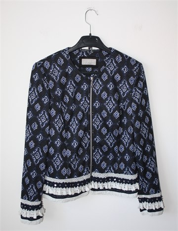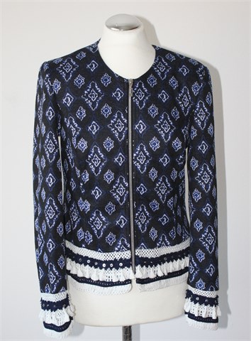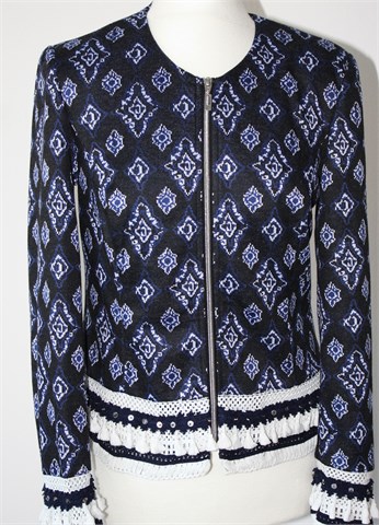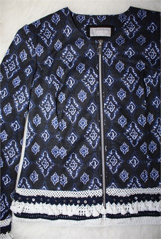 Canda (C&A) blazer/sako/jakna crne boje sa plavo-bijelim printom (uzorak printa vidljiv na slikama). Prednje kopčanje sa cifom, ukrašen heklanim aplikacijama od bijelog i plavog konca i našivene perlice. Podstavljen, rastezljiv. Jastučići u ramenima.