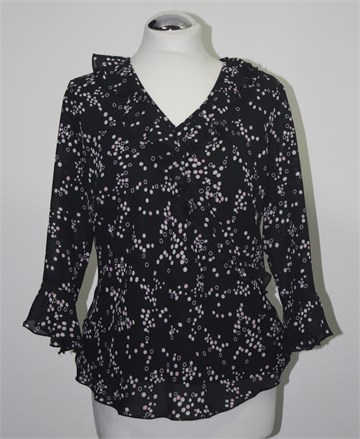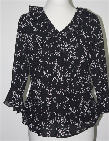 Canda (C&A) bluza sa poludugim rukavima, crne boje sa točkastim printom (u rozoj i bijeloj boji). Oko prednjeg otvora i na krajevima rukava volančić. Lagana i prozračna, podstavljena.