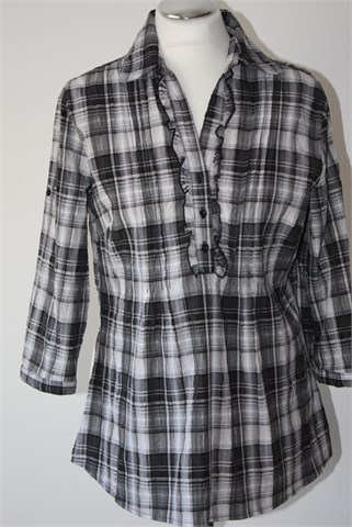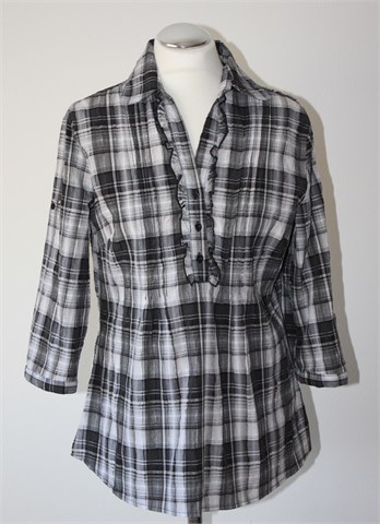 Canda (C&A) bluza sa poludugim rukavima, kombinacija crne-sive i bijele boje s uzorkom. Sa prednje strane gumbići, ukrasni volančići i prošivi. Rukavi se mogu nositi i kao kraći (gumbić sa vanjske strane rukava i vezica unutar rukava). Blago rastezljiva.