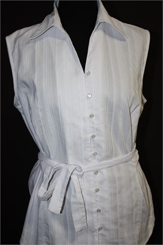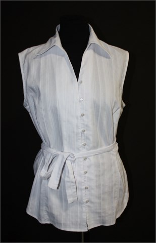 Canda (C&A) košulja bez rukava, bijele boje sa diskretnim prugama (mjestimično blago šljokavim). Prednje kopčanje, vezanje u struku (fiksni remenčić), strukirana. Mekan i rastezljiv materijal.