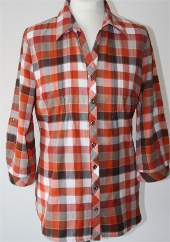 Canda (C&A) košulja sa kockasto-kariranim uzorkom (boje i uzorak vidljiv na slikama), rukavi su poludugi (mogu se nositi i kao kraći - gumbić sa vanjske strane rukava i vezica unutar rukava). Prednje kopčanje, ukrasni prošivi sa prednje strane, blago strukirana.