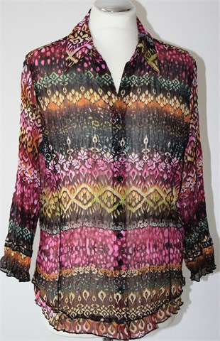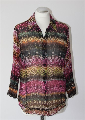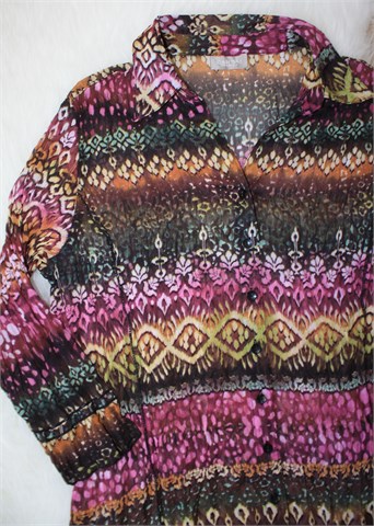 Canda (C&A) košulja sa poludugim rukavima i šarenim printom/uzorkom (boje i uzorak printa kao na slikama). Prednje kopčanje, materijal je zgužvanog izgleda (može se zapeglati). Rastezljiva, providna.