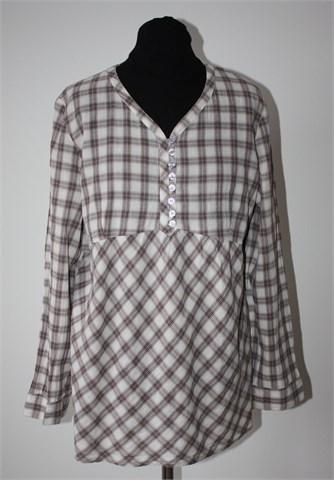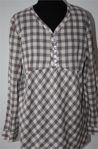 Canelle bluza sa dugim rukavima i prugasto-kariranim uzorkom (boje i uzorak vidljivi na slikama). Prednji gumbići, 2 gumbića na kraju svakog rukava. Tanji lagan pamuk, nije rastezljiv.