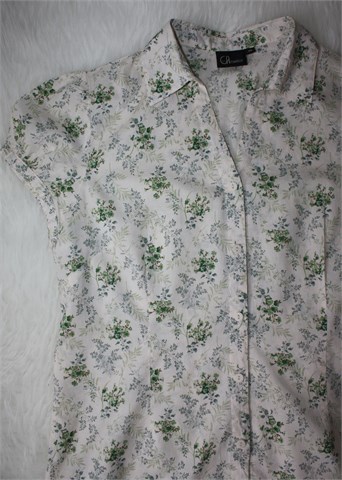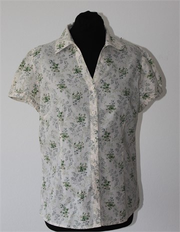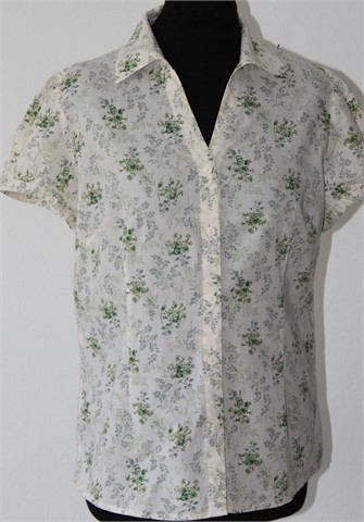 Canelle košulja sa kratkim rukavima, nude (rozo-bež) boje sa cvjetnim printom (boje i uzorak printa kao na slikama). Prednje kopčanje, vrlo blago strukirana. Nije rastezljiva.