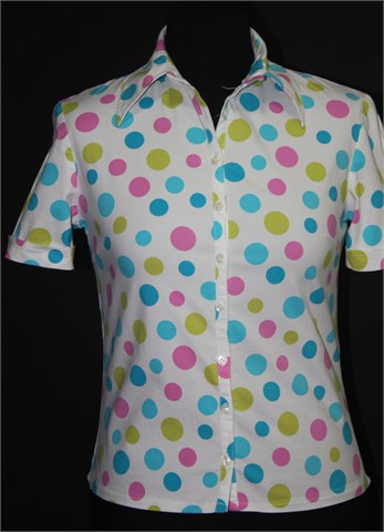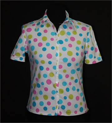 Carmen košulja sa kratkim rukavima, bijele boje sa šarenim printom točkica/krugova (boje i uzorak kao na slikama). Prednje kopčanje, prednji ušitci za grudi. Blago rastezljiv materijal, lijepo se formira po tijelu.