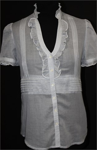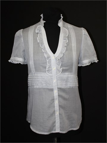 Carmen košulja sa kratkim rukavima, bijele boje sa tamnim točkicama. Prednje kopčanje, volančići i ukrasni prošivi sa prednje strane. Tanji i lagan pamuk, providan.