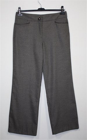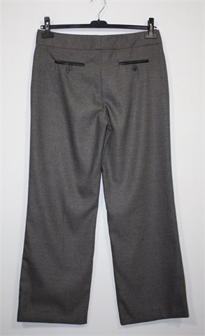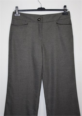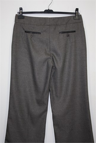 Caroll hlače od tanjeg štofastog materijala, smeđe-bež boje s uzorkom. Prednji cif i unutarnje kopčanje sa kopčicama (sa vanjske strane ukrasni gumb). Prednji džepovi, stražnji samo ukrasni (rub džepova je od umjetne kože). Blago rastezljive.