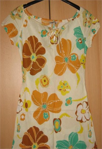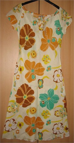 Prekrasna ljetna haljina. Kratki rukavići, dekolte stegnut gumicom koja se veže u mašnicu. Strukirana. Bočni cif je potrgan i treba ga promijeniti (zato i niža cijena). Inače haljina je potpuno nova, još uvijek sa etiketom. Piše veličina L (vidjeti mjere).