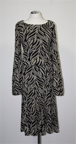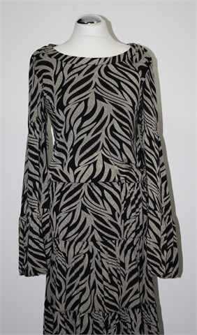 Carpe Diem haljina sa poludugim rukavima, prošarani uzorak (većinom u crno-sivo bež boji sa sitnim detaljima u crvenoj i tamno ljubičastoj). Širi rukavi koji se pri kraju proširuju (materijal je na krajevima rukava dupli pa ima lijepi pad), donji dio haljine mjestimično stegnut gumicama. Lagan i rastezljiv materijal (odlična kombinacija viskoze i elastina).