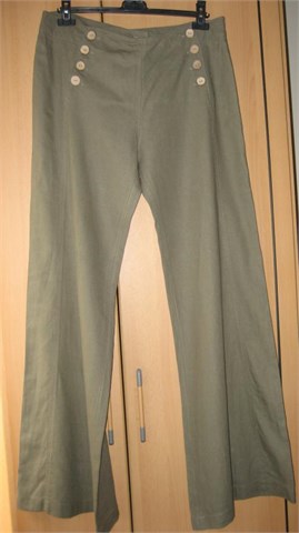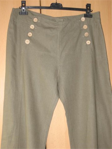 Lagane i prozračne ljetne hlače, maslinasto zelene boje. Kopčanje na 8 vanjskih gumba i tri unutarnja. Široke nogavice. Nemaju džepova. Nisu rastezljive. Na hlačama piše veličina XXL (vidjeti mjere).