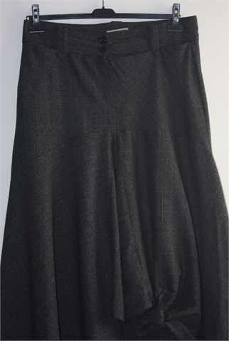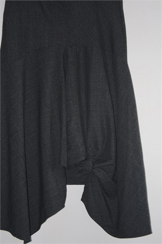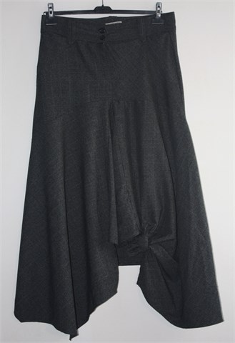 Carpe Diem suknja od laganog štofa prošarano sive boje (uzorak kao na slici). Asimetričnog kroja, prednji bočni dio je nešto duži od ostatka suknje. Prednji cif i kopčanje, pasica za remen. Nije podstavljena, materijal je mrvicu rastezljiv.