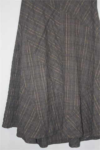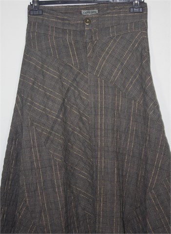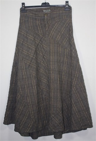 Carpe Diem dugačka suknja smeđe boje (sa uzorkom), mjestimično protkana sjajnim zlatnim nitima. Prednji cif i kopčanje. Materijal je kao lagani štof, blago zgužvan.