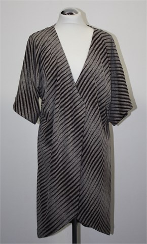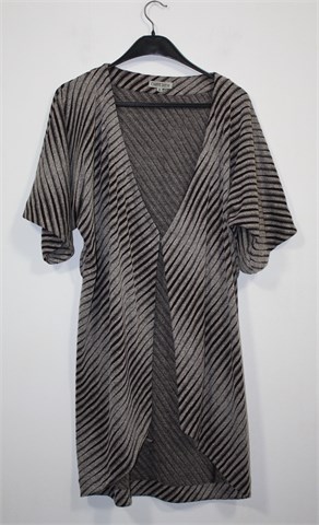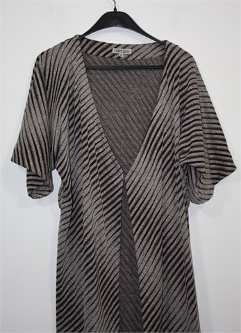 Carpe Diem vrlo neobična i lijepa vesta/kardigan sivo-smeđe-bež boje sa pomalo retro uzorkom. Rukavi su kraći i široki pa je odlična za slojevito oblaćenje. Sa prednje strane preklop (i unutarnje vezanje sa vezicama), sa vanjske strane je samo preklop i postoje bočne ušice za remen pa je predviđeno da se nosi sa remenom i tako se fiksira preklop (uz vestu ne dolazi remen ali može se nositi bilo kakav). Materijal se ne gužva pa je odlična za održavanje. Duža sa stražnje strane (vidjeti mjere za stražnju stranu).