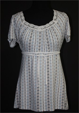 Casa Blanca duža majica/tunika sa kratkim rukavima, bijele boje sa printom (u smeđe-bež-plavoj kombinaciji). Bočne vezice (mogu se zavezati sa prednje ili stražnje strane), dekolte ukrašen heklanom trakom. Blago stegnuta gumicom na kraju svakog rukava. Mekan i rastezljiv materijal.