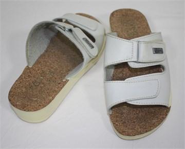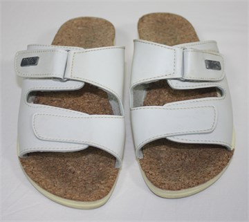 Casa Mia natikače sa povišenom petom bijele boje, gornjište je bijele boje sa čičak trakom. Gazište je od pluta.