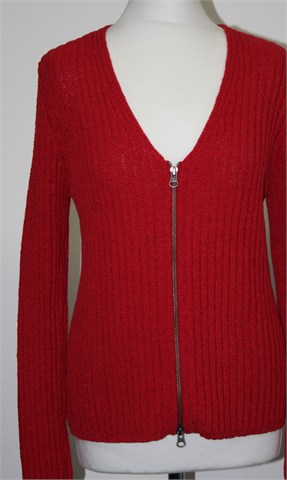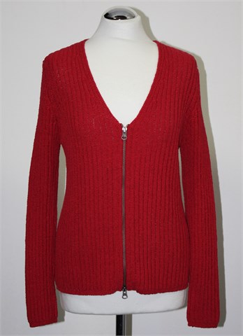 Cassani vesta sa prednjim kopčanjem sa cifom (cif je dvostrani), ugodne crvene boje (malo zagasitija nijansa nego na slici). Deblje ali lagano i rastezljivo pletivo.