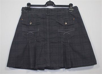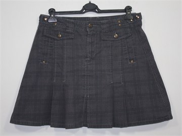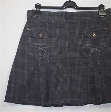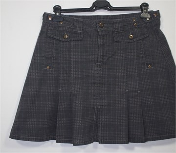 Casual Clothing suknja sive boje sa uzorkom. Prednji cif i kopčanje, pasica za remen. Prednji ukrasni, stražnji džepovi sa preklopom i gumbom. Falde sa prednje i stražnje strane. Na pasici (bočno) drukeri za regulaciju širine u struku.