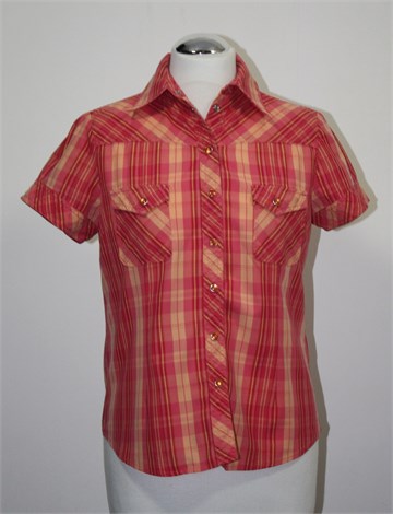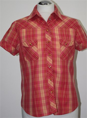 Casual Wear košulja sa kratkim rukavima, crveno-narančaste boje sa prugasto-kariranim uzorkom. Prednje kopčanje sa drukerima (svi gumbi su ukrasni drukeri), mali džepići na prsima. Strukirana, čvrst i deblji pamuk.