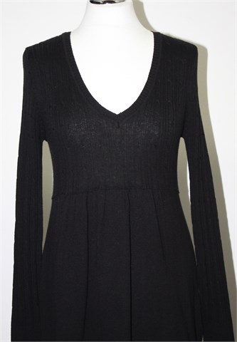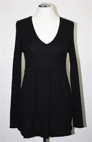 Casual Wear duža vesta/tunika sa dugim rukavima, crne boje. Sa prednje strane V otvor, rezana ispod grudiju i prema dolje se blago širi. Gornji dio i rukavi sa uzorkom pletenica. Tanje i rastezljivo pletivo.