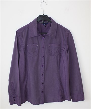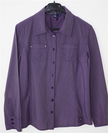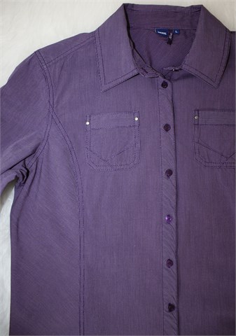 Cecil košulja sa dugim rukavima, ljubičaste boje sa prugama (vidljivo na slikama). Prednje kopčanje, džepići na prsima. Nije rastezljiva.
