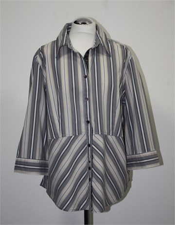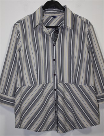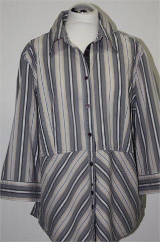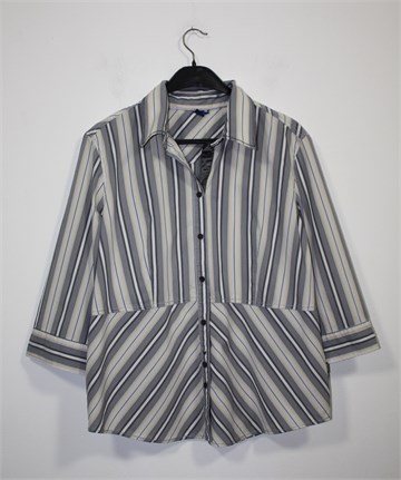 Cecil košulja sa poludugim rukavima, prugasta (kombinacija sive, bijele i zagasito žute boje). Prednje kopčanje, blago strukirana. Gumbići na kraju svakog rukava. Blago rastezljiva.