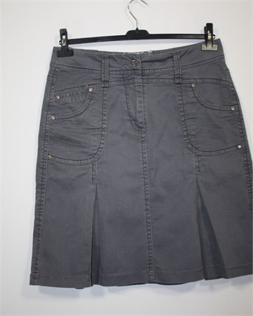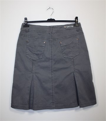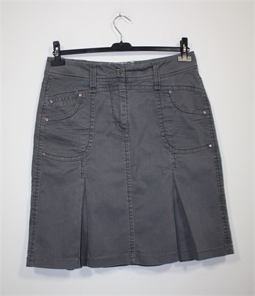 Cecil traper suknja sive boje, blago ispranog izgleda. Prednji cif i kopčanje, pasica za remen. Prednji i stražnji džepovi, falde sa prednje i stražnje strane.