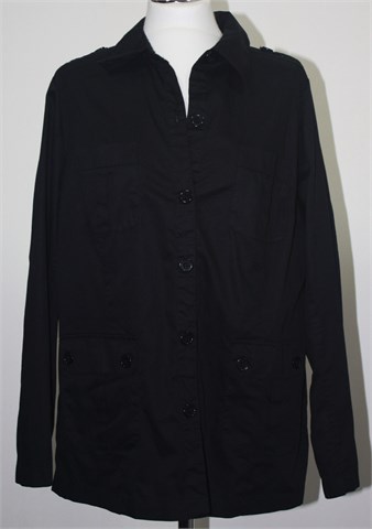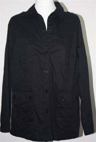 Celaia kratki baloner ili lagana jakna, crne boje. Prednje kopčanje, bočni džepovi i džepovi na prsima. Vezanje u struku (remen dolazi uz jaknicu). Lagan pamučni materijal.