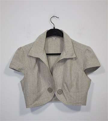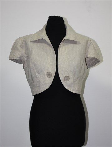 Charif kratka jaknica/bolero sa kratkim rukavima, svijetlo bež boje sa bijelim diskretnim prugama. Otvorena sa prednje strane (gumbi su ukrasni), blagi puf rukavići. Čvrst i deblji lan.