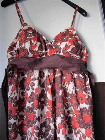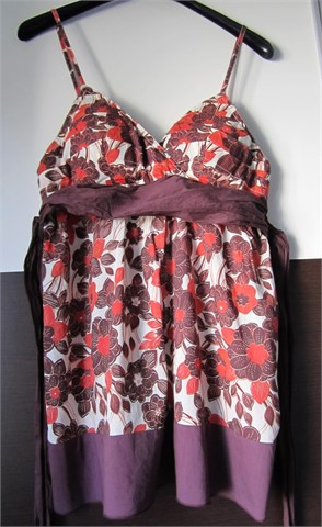Charlotte Russe duži topić/tunika sa cvjetnim printom i vezanjem. Tanke prilagodljive naramenice (kao na grudnjaku), prednji dio je podstavljen sa ušivenim jastučićima tako da se ne mora nositi grudnjak (ukrašeno faldicama). Sa stražnje strane je cif (na sredini) i gumica na stražnjem dijelu topića tako da je prilagodljiva širina. Lagan i prozračan pamuk.