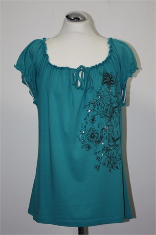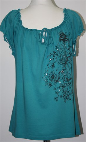 Cheer majica sa kratkim rukavima, tirkizne boje sa prednjim printom (vidljivo na slikama). Blago stegnuta gumicom na krajevima rukava i oko ovratnika. Mekan, tanji i rastezljiv pamuk.