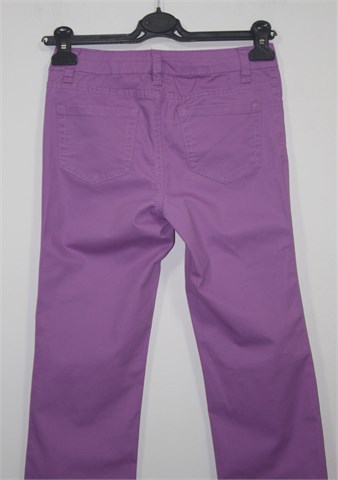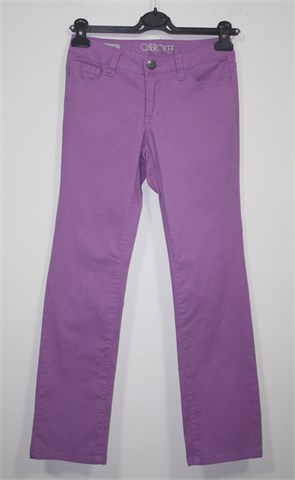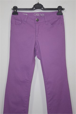 Cherokee hlače svijetlo ljubičaste boje, materijal je kao tanji traper. Prednji cif i kopčanje, pasica za remen. Prednji i stražnji džepovi. Blago rastezljive. Pasica je prilagodljive širina (s unutarnje strane ušivena je guma pa se širina regulira sa gumbićem).
