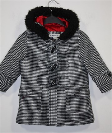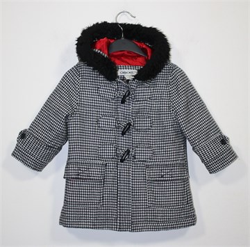 Cherokee kaput sa pepita uzorkom u crno-bijeloj kombinaciji (vidljivo na slikama). Prednji (skriveni) cif i kopčanje sa ukrasnim gumbima. Bočni džepovi sa zatvaranjem na čičak, kapuljača obrubljena umjetnim crnim krznom. Podstava je crvene boje (par sitnih oštećenja-crtica na postavi). Blago podstavljen.