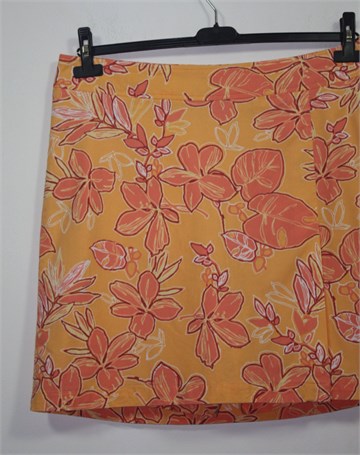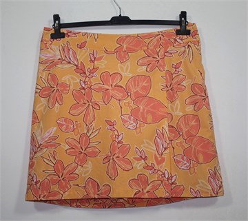 Cherokee suknja s ušivenim hlačicama, svijetlo narančaste boje sa cvjetnim printom (boje i uzorci kao na slikama). Prednji fiksni preklop, bočni cif i gumbić. Blago rastezljiva.