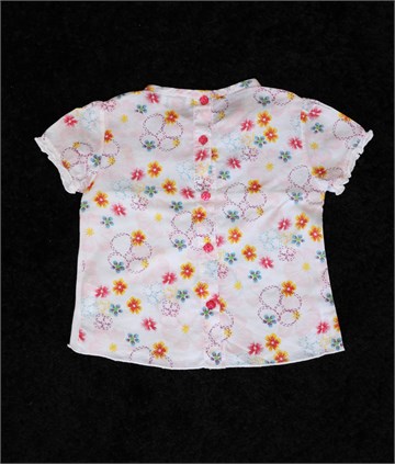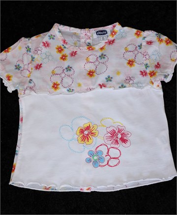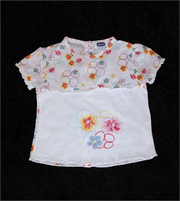 Chicco majica/bluza sa kratkim rukavima, bijele boje sa cvjetnim printom (boje i uzorak printa vidljivi na slikama). Gumbići sa stražnje strane. Tanka i mekana.