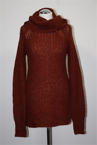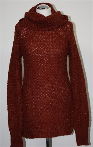 Chicoree duža vesta/tunika sa većim dolčevita ovratnikom, boja je nešto između zagasito narančaste i smeđe boje (boja cigle) sa upletenim sjajnim nitima. Mekano, toplo i rastezljivo pletivo.