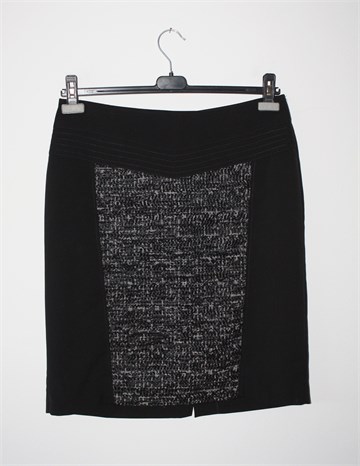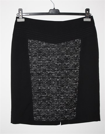 Choice suknja crne boje od tanjeg i glatkog štofa, sa prednje strane ušiven deblji štof/tvid crno-bijele boje (vidljivo na slikama). Prednji ukrasni prošivi ispod pasice, stražnji prorez na sredini suknje. Stražnji cif, podstavljena. Suknja je nešto duža sa stražnje strane (vidjeti mjere).