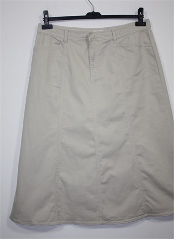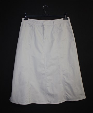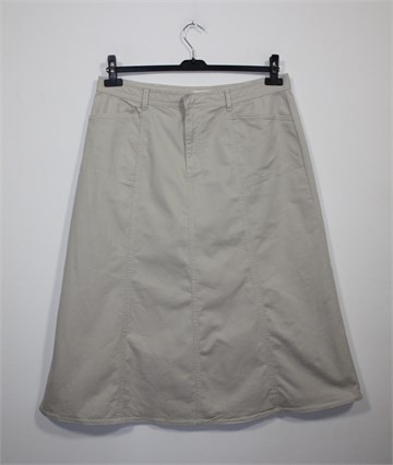 Christopher & Banks duža suknja svijetlo sivo-bež boje. Prednji cif i kopčanje, pasica za remen. Prednji džepovi, ukrasni prošivi sa obje strane. Materijal djeluje kao tanji traper, blago rastezljiv.