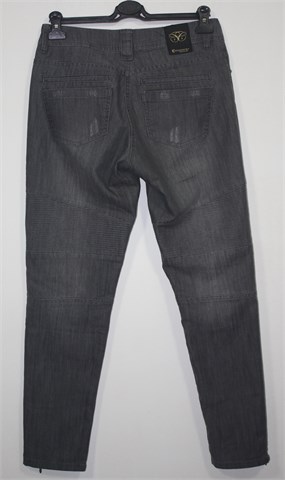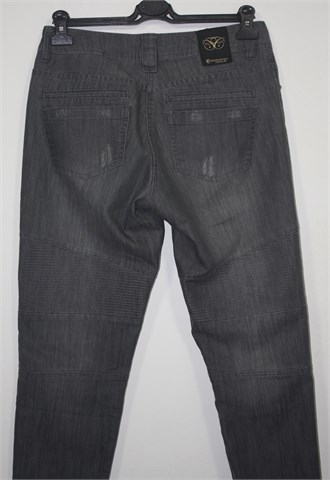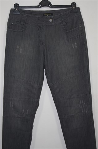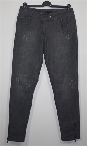 Claire jeans hlače od trapera sive boje. Prednji cif i kopčanje, pasica za remen. Prednji i stražnji džepovi. Mjestimično ispranog i iscufanog izgleda (tvornički). Ukrasni preštepi na nogavicama sa obje strane. Na dnu nogavica (sa vanjske strane) cifovi. Vrlo blago rastezljive.