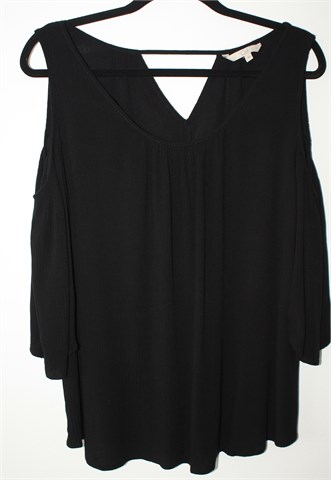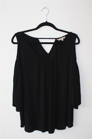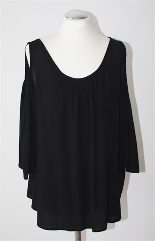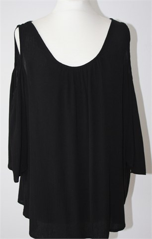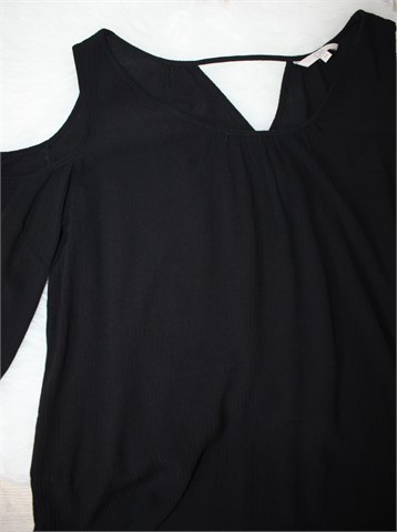 Clockhouse (C&A) bluza sa poludugim rukavima crne boje, otvori na ramenima (ramena nisu pokrivena sa materijalom). Mali otvor na leđima (vidljivo na slikama), materijal blagog izgleda krepa. Blago rastezljiva.