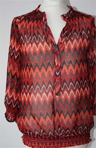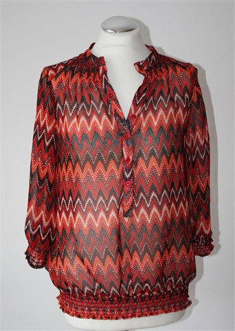 Clockhouse (C&A) bluza sa poludugim rukavima i šarenim uzorkom (boje i uzorak kao na slikama). Prednji gumbići, prošivena gumicama na krajevima rukava, pasici i oko ovratnika. Tanka i lagana, providna.