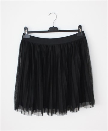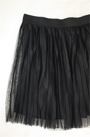 Clockhouse (C&A) plisirana suknja od mrežastog tila, crne boje. Gumica u struku (prilagodljiva širina - vidjeti mjere), podstavljena (podstava je cca 4 cm kraća od suknje).