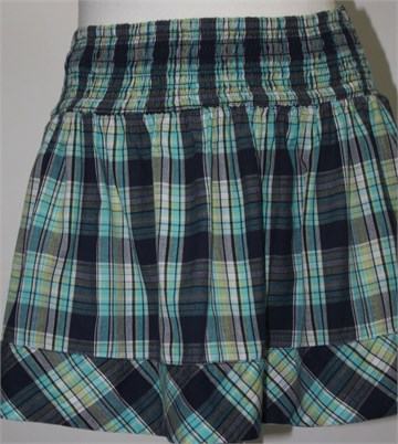 Clockhouse (C&A) kraća pamučna suknja, karirani uzorak u plavo-zelenoj kombinaciji (boje i uzorak kao na slikama). Prošivena gumicama u struku (prilagodljiva širina - vidjeti mjere), lagana i lepršava. Tanji pamuk.