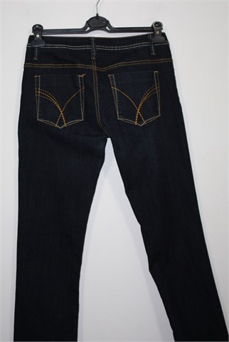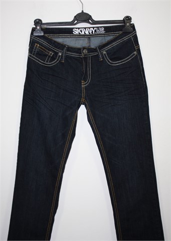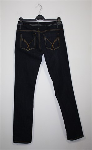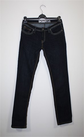 Clockhouse (C&A) traper hlače tamno plave boje, model je skinnny leg. Prednji cif i kopčanje, pasica za remen. Prednji i stražnji klasični džepovi (stražnji s aplikacijama od konca). Uske nogavice, rastezljive.