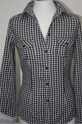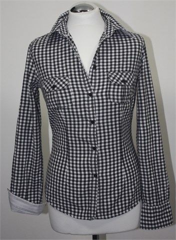 Clockhouse košulja sa dugim rukavima, kockasti uzorak u crno-bijeloj kombinaciji boja. Prednje kopčanje, džepići na prsima. Rukavi se mogu nositi i kao poludugi (vanjski gumbić i vezica unutar rukava).