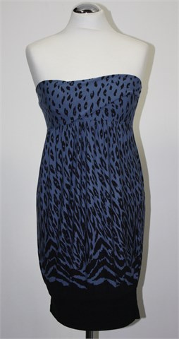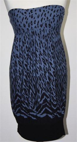 Clockhouse tunika ili kratka haljina plave boje sa crnim uzorkom (vidljivo na slikama), bez naramenica (leđa su otvorena). Pri dnu stegnuta pasicom, na leđima (uz gornji šav) ušivena je gumica pa je širina dosta prilagodljiva (vidjeti mjere). Mekana i rastezljiva.