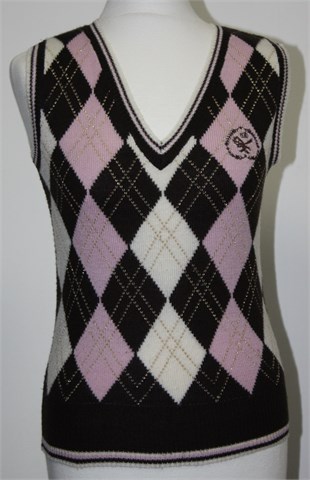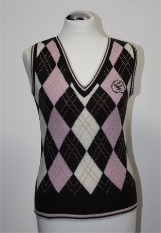 Clockhouse vesta bez rukava, tamno smeđe boje - sa prednje strane uzorak rombova (u rozoj i bijeloj boji - mjestimično upletene sjajne zlaćane niti). Tanje, mekano i rastezljivo pletivo.